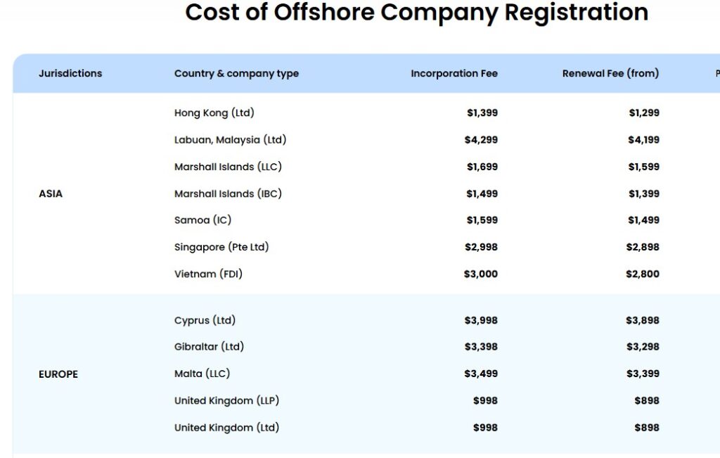 Cost of Offshore Company Registration Table